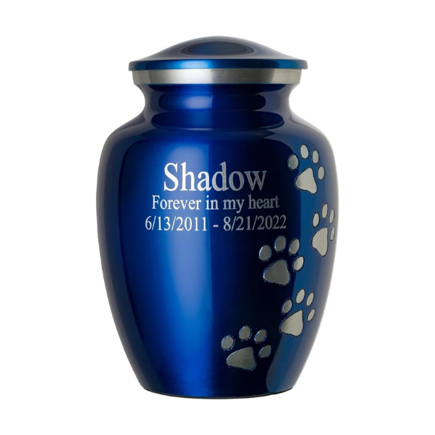 Pet Urn for Dogs and Cats with Personalized Laser Engraving, Ottillie Paws Premier Series Memorial Urns (Medium Sapphire Blue with Vertical Pewter Paws)