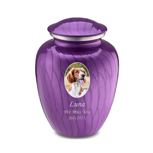 Embrace Portrait Urns for Pet Ashes, Cremation Urns for Pets, Vault with Custom Engraving I Pet urn with UV Printed Photo (Pearl Purple)