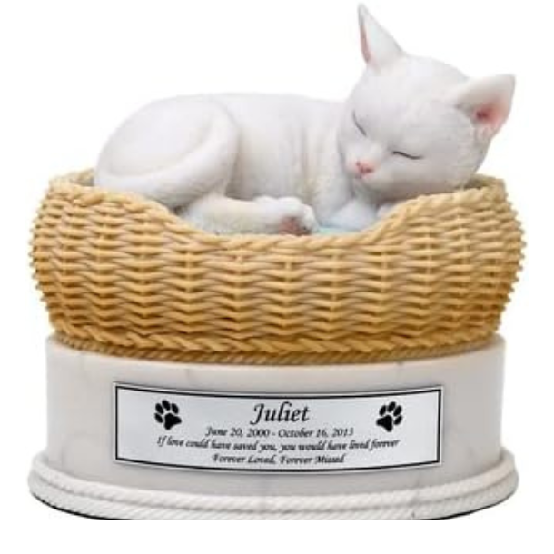 Perfect Memorials Custom Engravable Hand Painted White Cat in Basket Cremation Urn (25 Cu/in) – Cat Urns for Ashes Keepsake for Ashes/Personalized Plaque/cat Memorial Gifts for Loss of cat/pet urn
